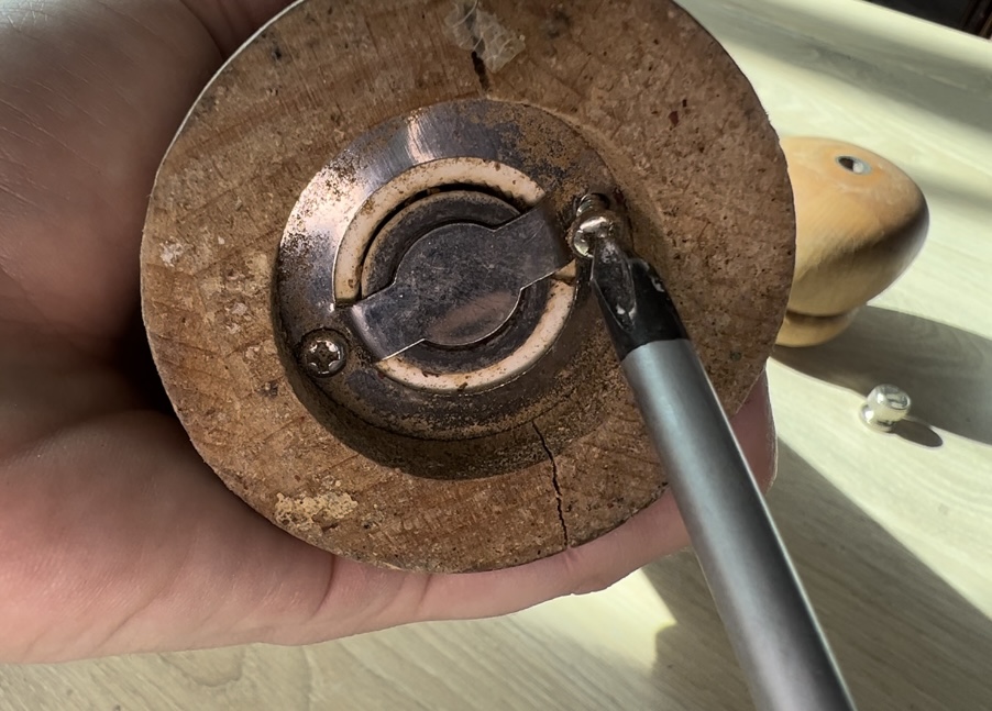 Nu de onderdelen van de pepermolen zijn schoongemaakt en hersteld, is het tijd om de pepermolen weer in elkaar te zetten. Gebruik je notities om ervoor te zorgen dat alle onderdelen op de juiste manier gemonteert zijn. Draai de schroeven voorzichtig vast, zodat je de onderdelen niet beschadigt.