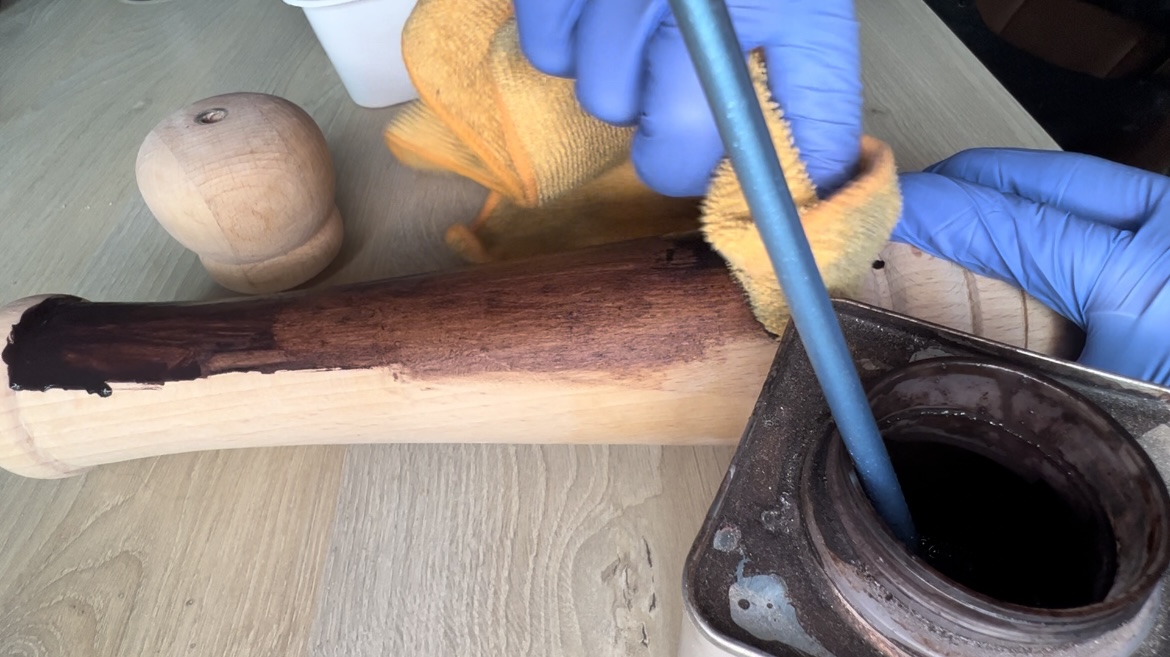 Nu de houten onderdelen van de pepermolen zijn geschuurd, is het tijd om een afwerkingslaag aan te brengen. Ik wou een mooie donkere perpermolen dus ik koos voor een Mahonie tint.
