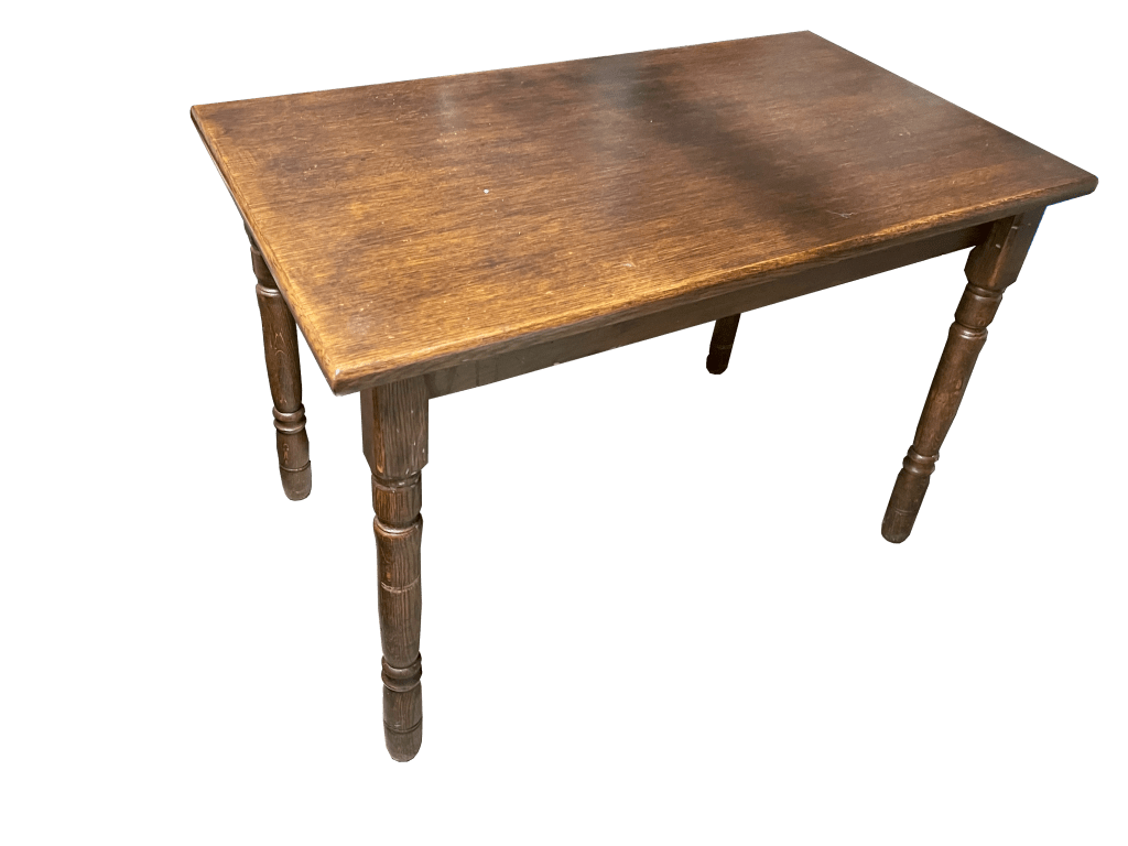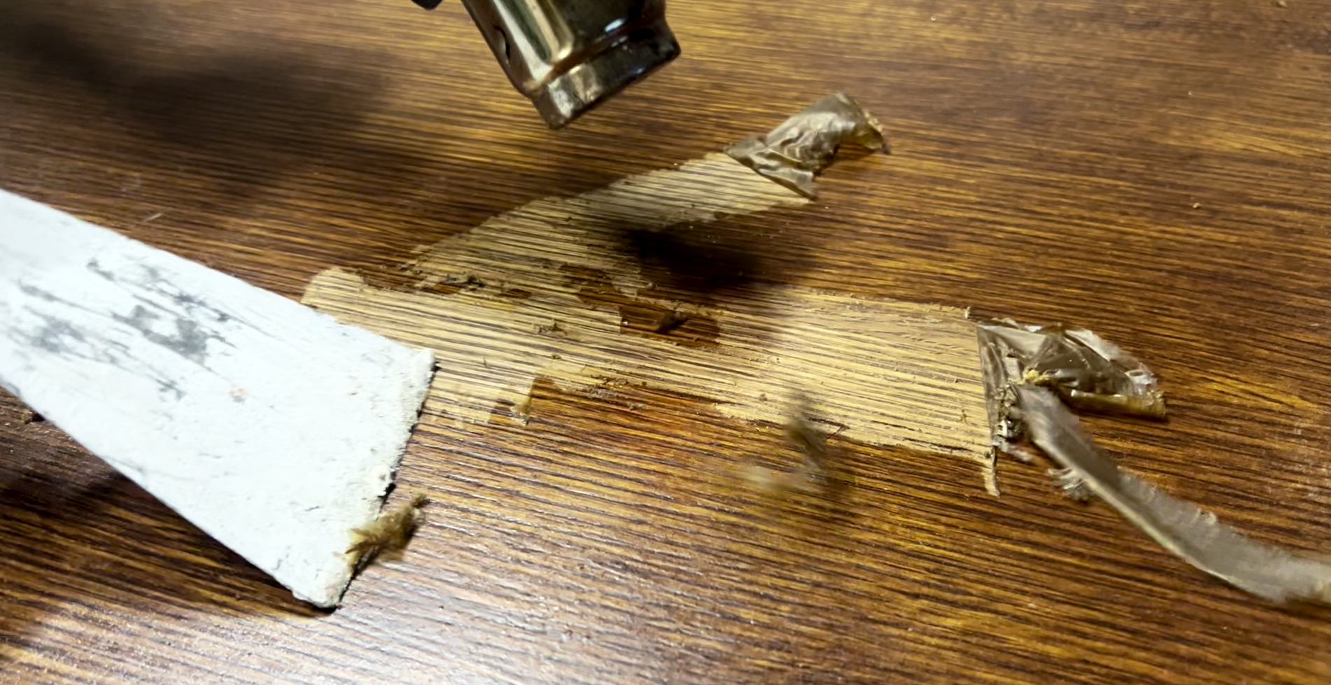 Mijn tafel, net zoals zovele oude houten tafels, is zwaar gelakt, maar hoe moet je nu zo een gelakte tafel opknappen? Het proces begint met het verwijderen van de oude lak- of vernislaag van je tafel. Ik gebruik hiervoor een heteluchtpistool om de lak zacht te maken en vervolgens gemakkelijk te kunnen wegschrapen. Dit kan met het speciale opzetstuk van het heteluchtpistool of met een plamuurmesje. Zorg ervoor dat je de de warmte van het hetluchpistool gelijkmatig verdeeld en werk in goed geventileerde ruimtes om de dampen te minimaliseren.