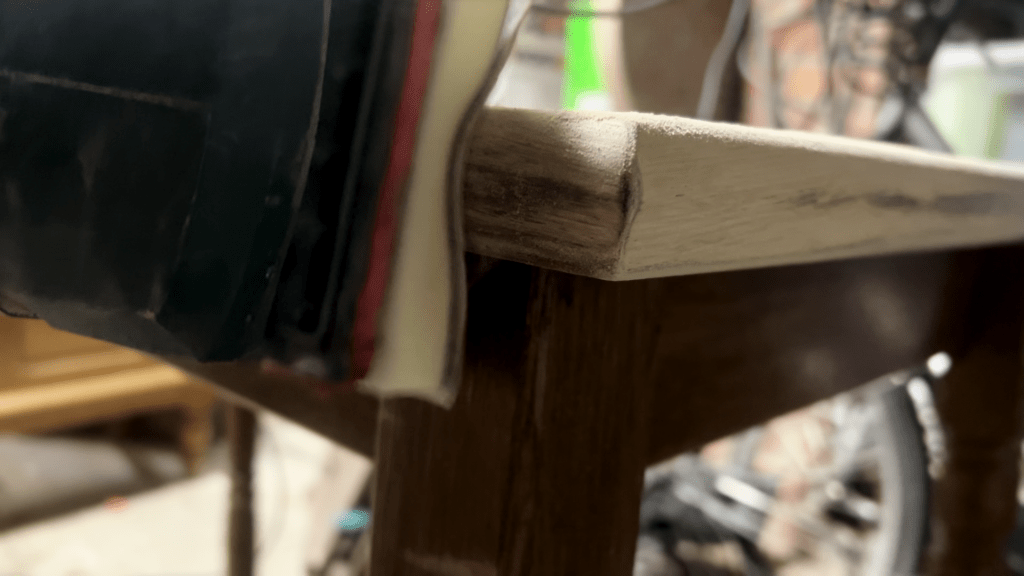 Ik gebruik een vlakschuurmachine met een sponzen interface pad op de randen van de tafel. Hierdoor kan ik de ronde vormen van de eettafel nauwkeurig volgen tijdens het schuren, waardoor het gemakkelijker wordt om de randen van deze eettafel op te schuren.