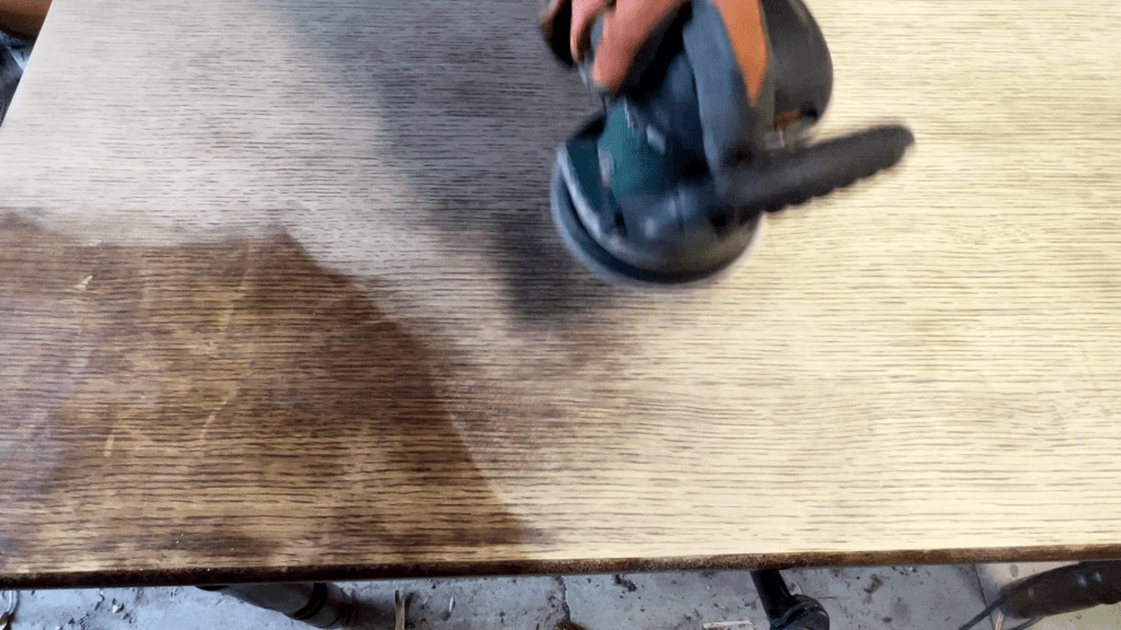 Ik gebruik mijn orbitale schuurmachine om de donkere beits die op het hout is aangebracht te verwijderen.