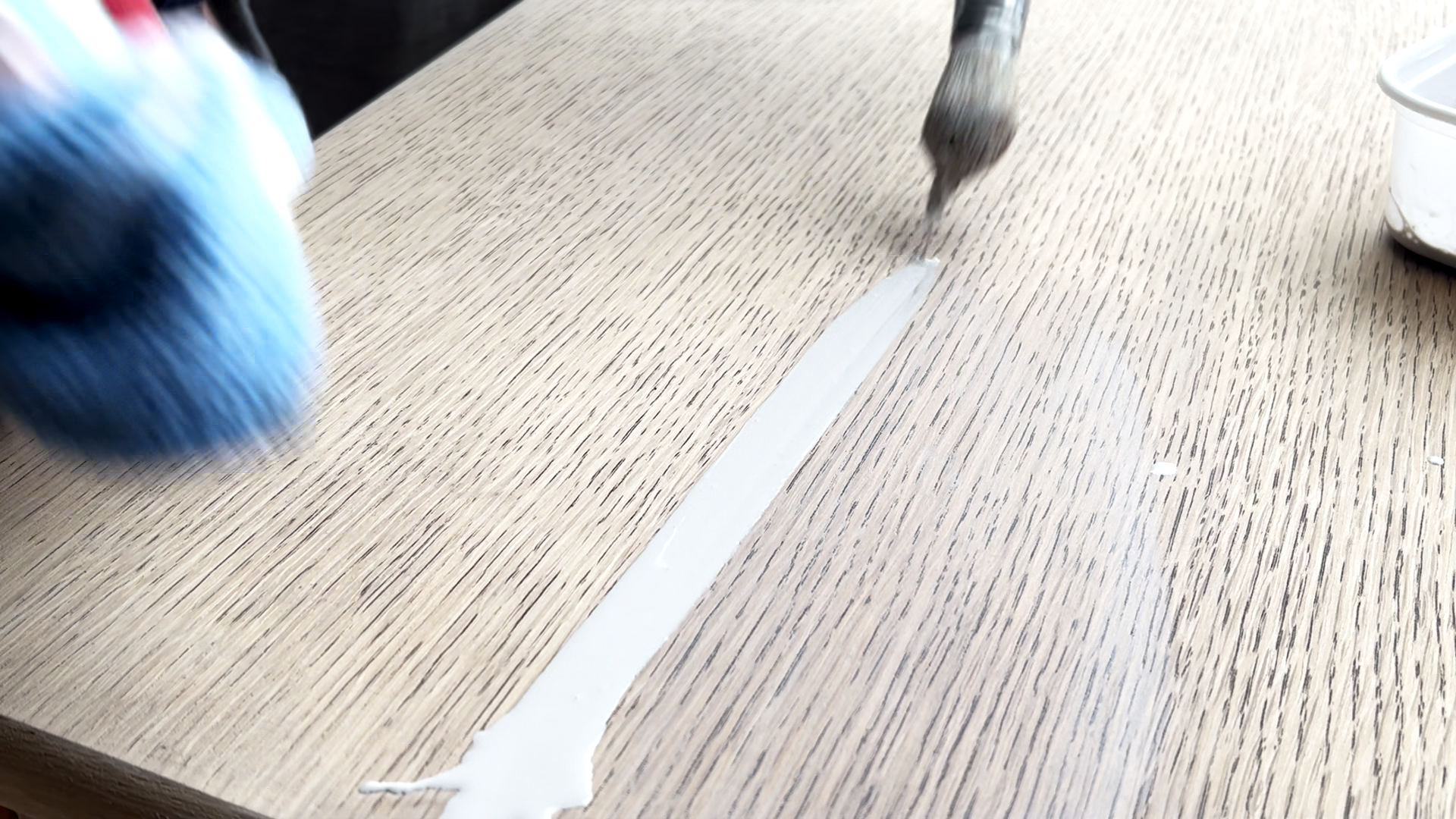 Nu komt het leuke gedeelte! Om die kenmerkende farmhouse uitstraling te creëren, gaan we de oranje tinten in het hout neutraliseren met behulp van een paint wash. Meng een waterige verf op basis van witte of grijze tinten en breng deze gelijkmatig aan op de eettafel. Laat de verf een beetje in de nerven van het hout trekken voor een natuurlijk uitziend effect en veeg deze vervolgens weg met een doek.