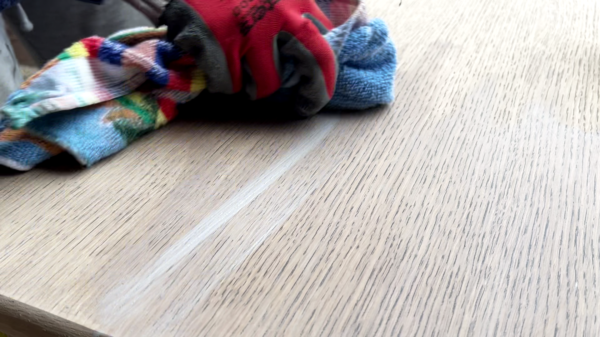 Hieronder zie je hoe ik de paint wash aanbreng en direct met een oude doek over het hout wrijf. Zoals eerder vermeld, is het belangrijk om met kleine hoeveelheden te werken en meerdere lagen aan te brengen, zodat je het gewenste effect geleidelijk kunt opbouwen. Het is namelijk gemakkelijk om te veel aan te brengen, waardoor je het hout volledig zou overschilderen en je weer opnieuw moet beginnen met schuren.