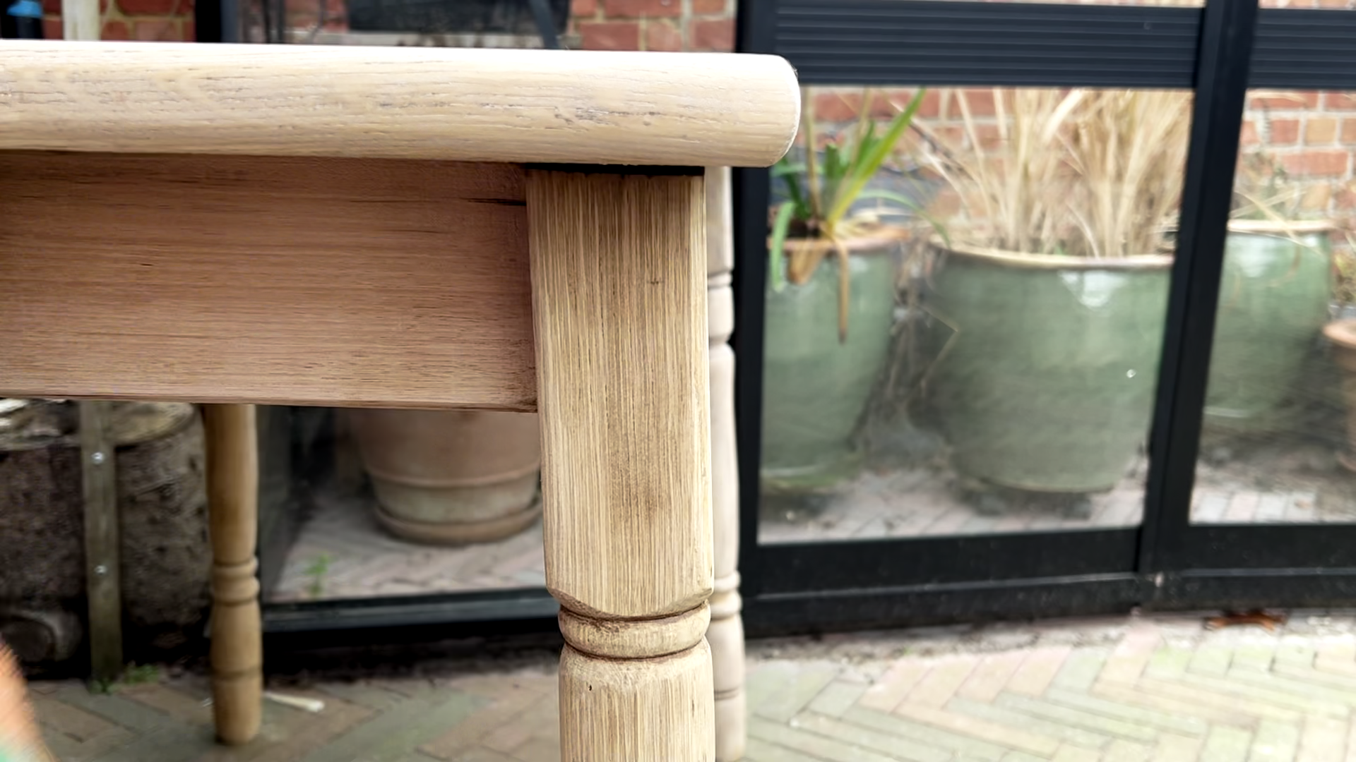 Ik schuur ook de tafelpoten van deze oude eettafel, zij het met iets minder precisie. Ik laat bewust wat van de oude vernis in de groeven van de poten zitten, omdat dit zal bijdragen aan de rustieke, landelijke stijl waar ik naar streef.