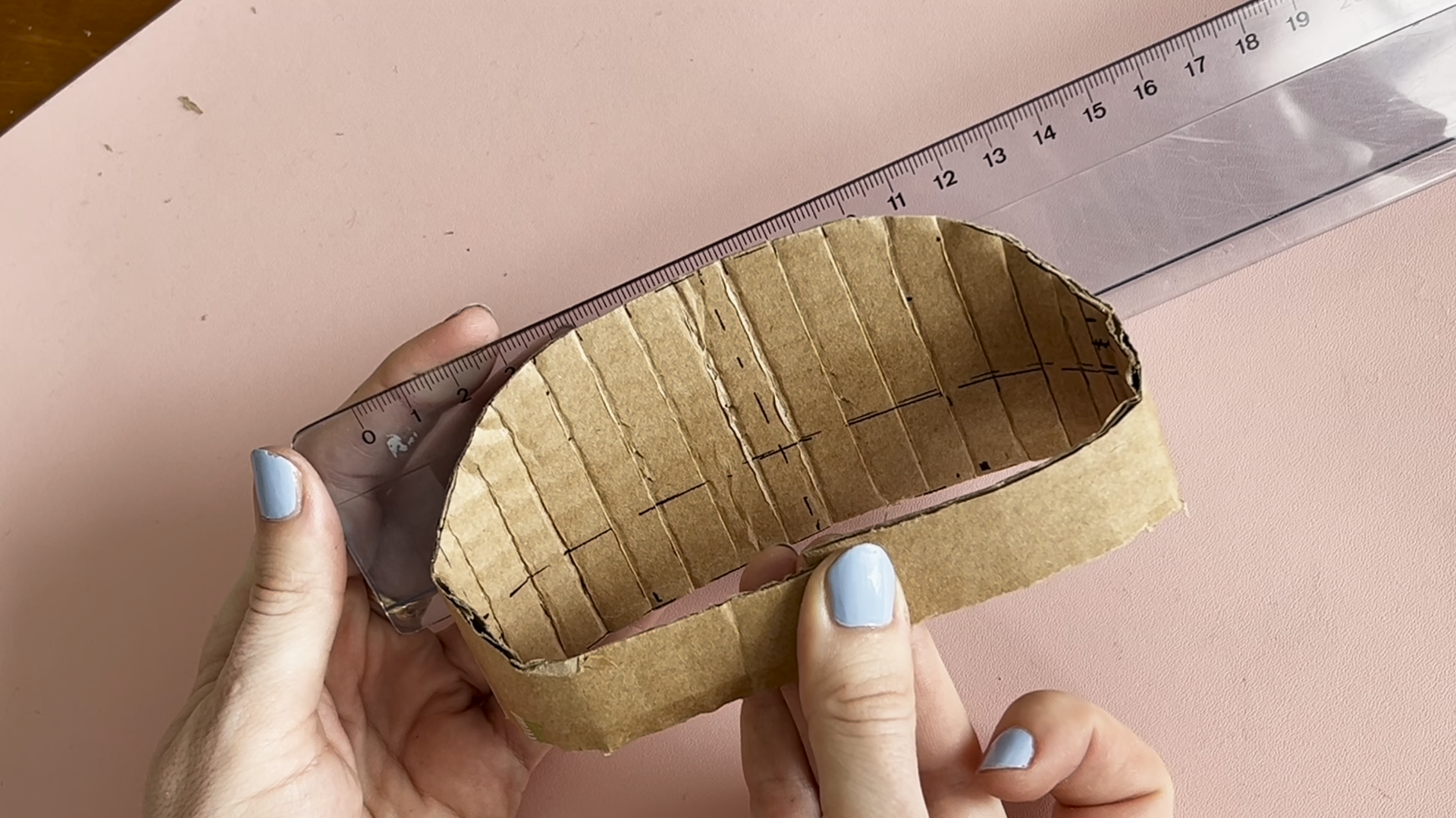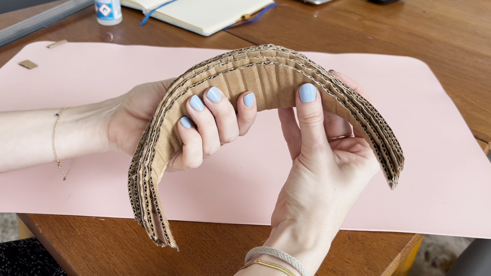 Daarna bracht ik de uiteinden van de vorm samen en lijmde ze vast. Ik voegde kleine reepjes karton toe om gaten te dichten en knipte stukjes karton af om overlap te corrigeren. Om de vorm tijdens het drogen te behouden, bond ik een lint rond de hele structuur.