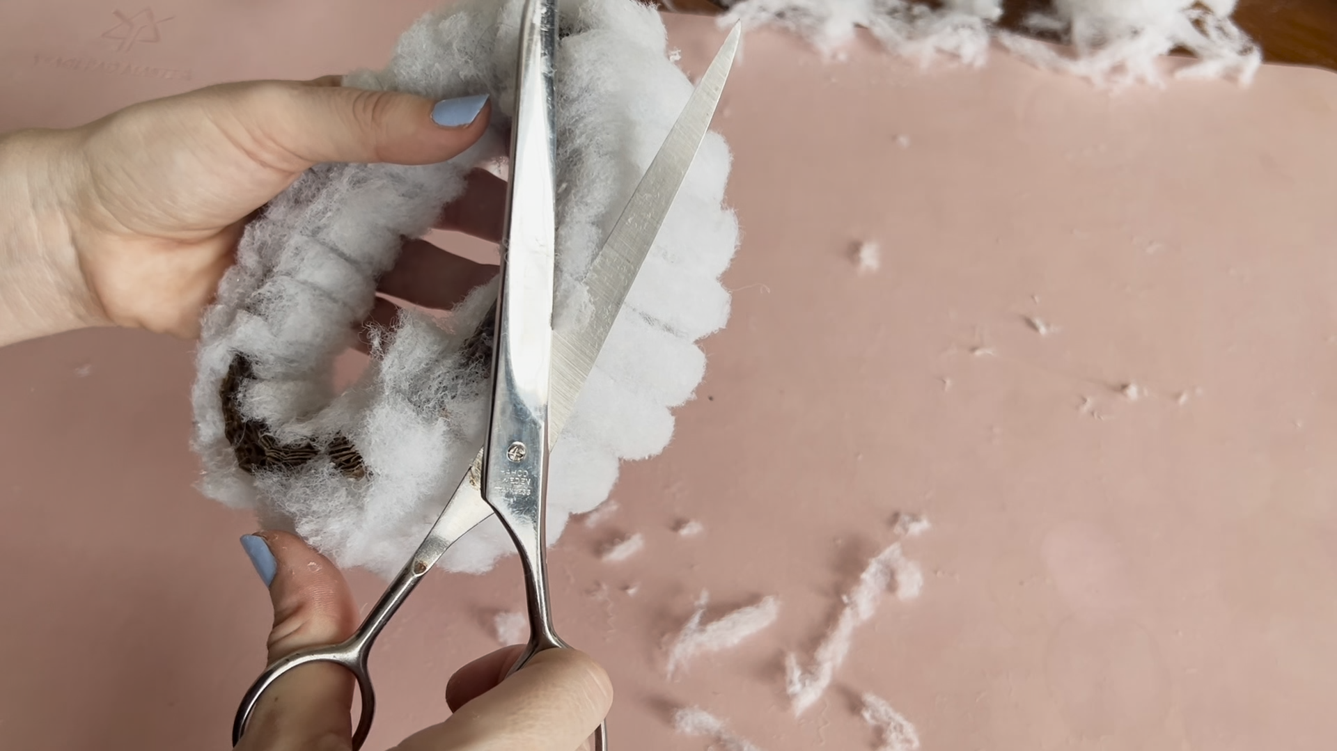 Ik herhaal dit proces totdat de hele zetel bedekt is met afgeronde reepjes kussenvulling. Aan de zijkanten van de zetel knip ik de reep nog in een punt, zodat deze aan de binnenkant past op het kleinere oppervlak van de mini-zetel. Met de schaar trim ik de zetel vervolgens nog meer in de vorm van de voorbeeldsofa.
