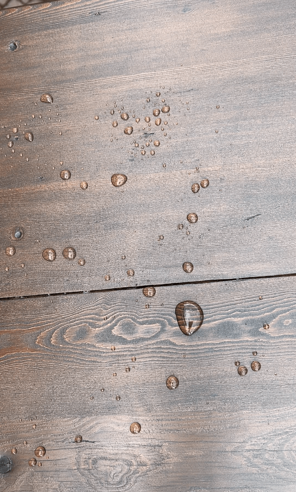 Hier zie je hoe de tafel waterafstotend is na het gebruiken van de meubelwas. Deze waslaag zorgt ervoor dat je tafel een duurzame afwerking krijgt die bestand is tegen de slijtage van dagelijks gebruik, terwijl het de natuurlijke, rustieke schoonheid van het hout behoudt.