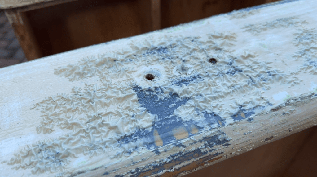 Met de handvaten verwijderd, was het tijd voor de volgende stap: het strippen van de oude verf van de schuiven. Omdat er zoveel oude verf op deze kast zat, wist ik al snel dat het afschuren met een schuurmachine een eindeloze klus zou worden. Bovendien brokkelde de verf op veel plekken al af, wat me deed besluiten dat een verfstripper de beste aanpak zou zijn. Het gebruik van een verfafbijtmiddel is een efficiënte manier om meerdere lagen verf tegelijk te verwijderen.