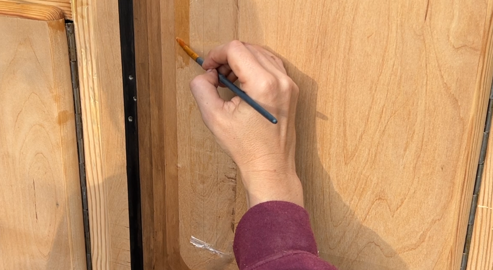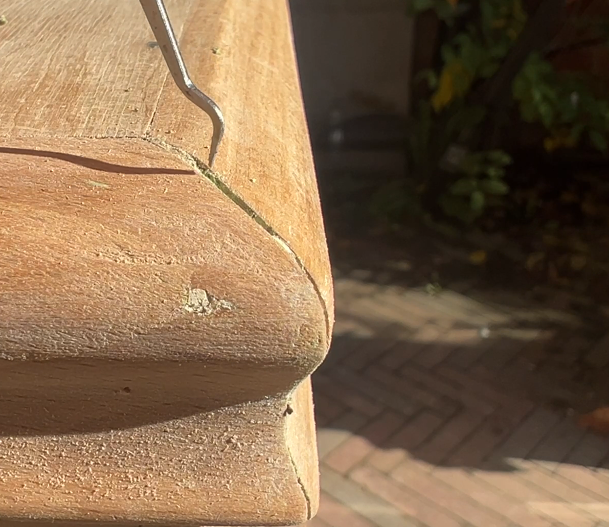 Met de oude verf eindelijk verwijderd, kwamen er enkele beschadigingen en veel voegen en scheuren tevoorschijn waar nog oude verf in zat. Deze krabde ik zorgvuldig schoon en vulde ik op met Houtvuller voor een strak en egaal resultaat. Het is niet makkelijk om kleine voegen te schrapen en daarom maak ik gebruik van een tandsteenverwijderaar om in die moeilijk bereikbare plekken te schrapen, misschien een beetje onconventieel maar echt heel handig!