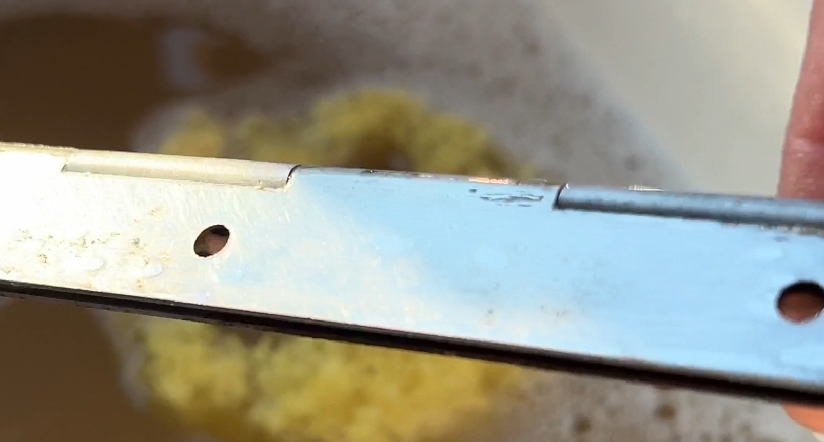 Om de handvaten en scharnieren aan te pakken maakte ik een sopje van warm water, azijn en zeep. Ik liet alle onderdelen hier een nachtje in weken. De volgende dag was het resultaat verbluffend: een groot deel van de roest was vanzelf van de scharnieren gevallen! Het verschil is duidelijk zichtbaar – kijk maar naar de foto’s hieronder om te zien hoeveel roest en vuil in het water lag.